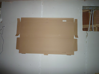 Here you can see a trial fit of a 65″ television shape on the wall of the cinema room, taken from being seated on the sofa in the picture above..