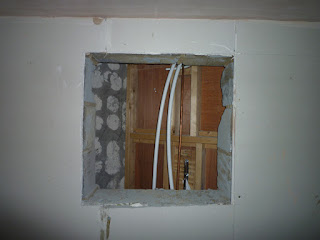 Here is a hole we cut in the cinema room wall for access to the rear of the shower, such that if I ever need to replace it, I don’t need to dismantle the shower enclosure.