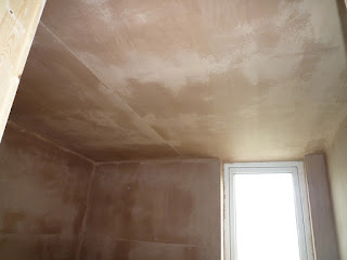 The outside wall and ceiling have received a coat of plaster.