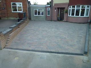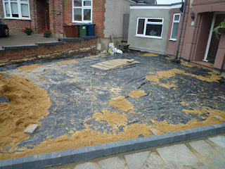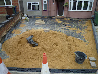 Having started the day by moving all of the blocks off the drive, they then proceeded to level the sand and start laying the blocks in a random pattern