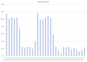 Gas usage for the month of March: 1,677kWh for 2025, 1849kWh for 2024 and 3615kWh for 2023.