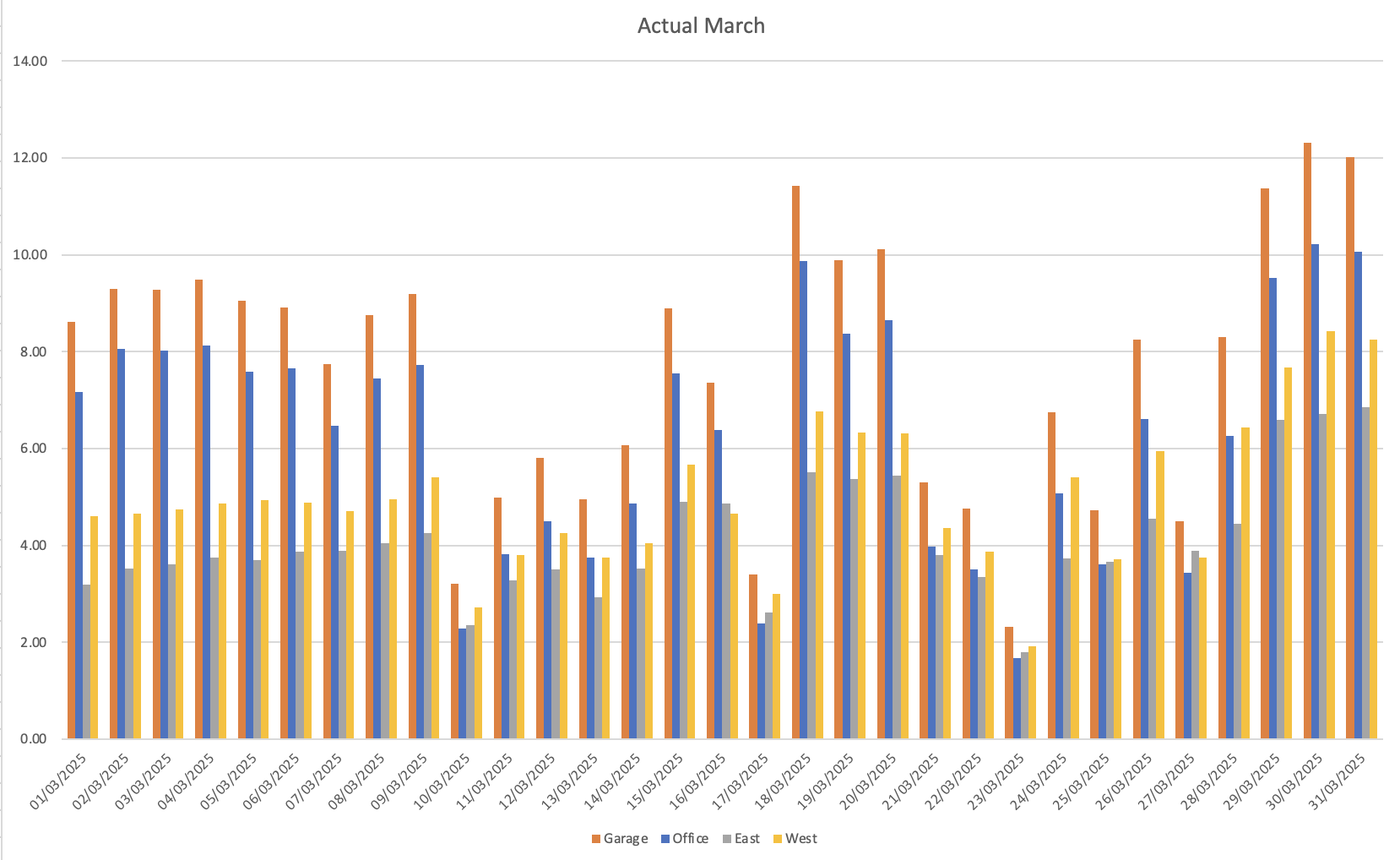 Electricity costs for the month of March: £148.76 for 2025, £438.81 for 2024 and £676.87 for 2023 – some great on-going savings.