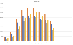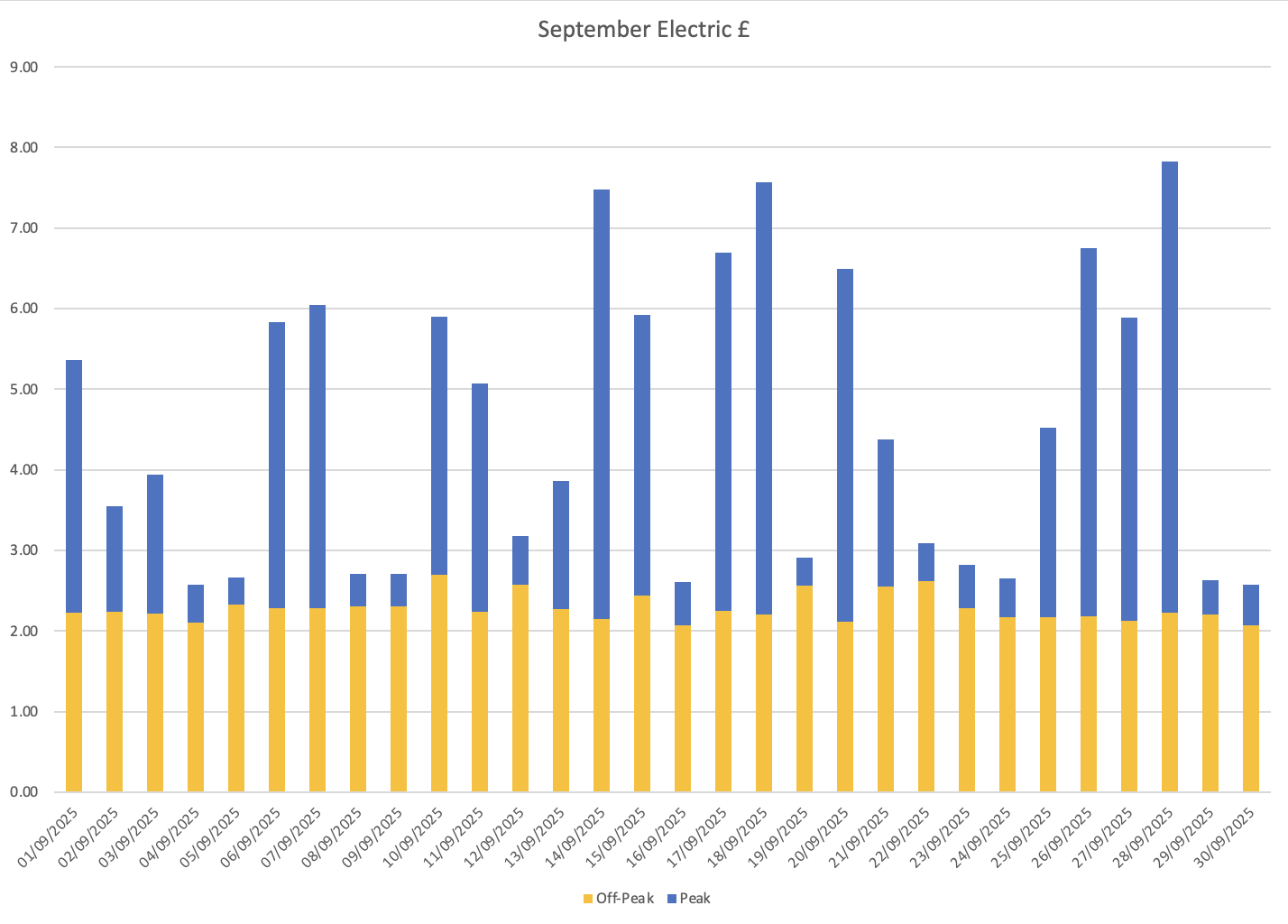The off-peak/peak/SC values for September were £0.07/0.24393/0.488 for 2024 vs £0.07/£0.2896/0.4542 for 2025, which are the same as last month.