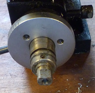 Then used the DRO to produce the 3 x mounting holes on a 32mm PCD then counterbored them with a 10mm drill, as the mounting screws are countersunk.